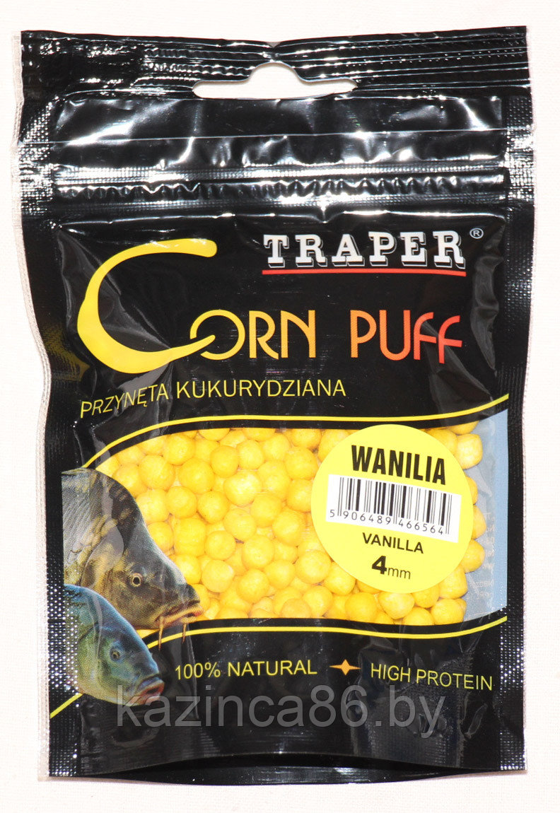 Corn puff wanilia (ваниль) – превосходная насадка, работающая по принципу шариков пенопласта. Содержит ароматизаторы, привлекающие рыбу. Может использоваться для ловли карпа, карася, голавля, язя, амура и другой рыбы. После попадания в воду размокает спустя 15 минут, поэтому подходит только для активной ловли (с частыми перезабросами кормушки).